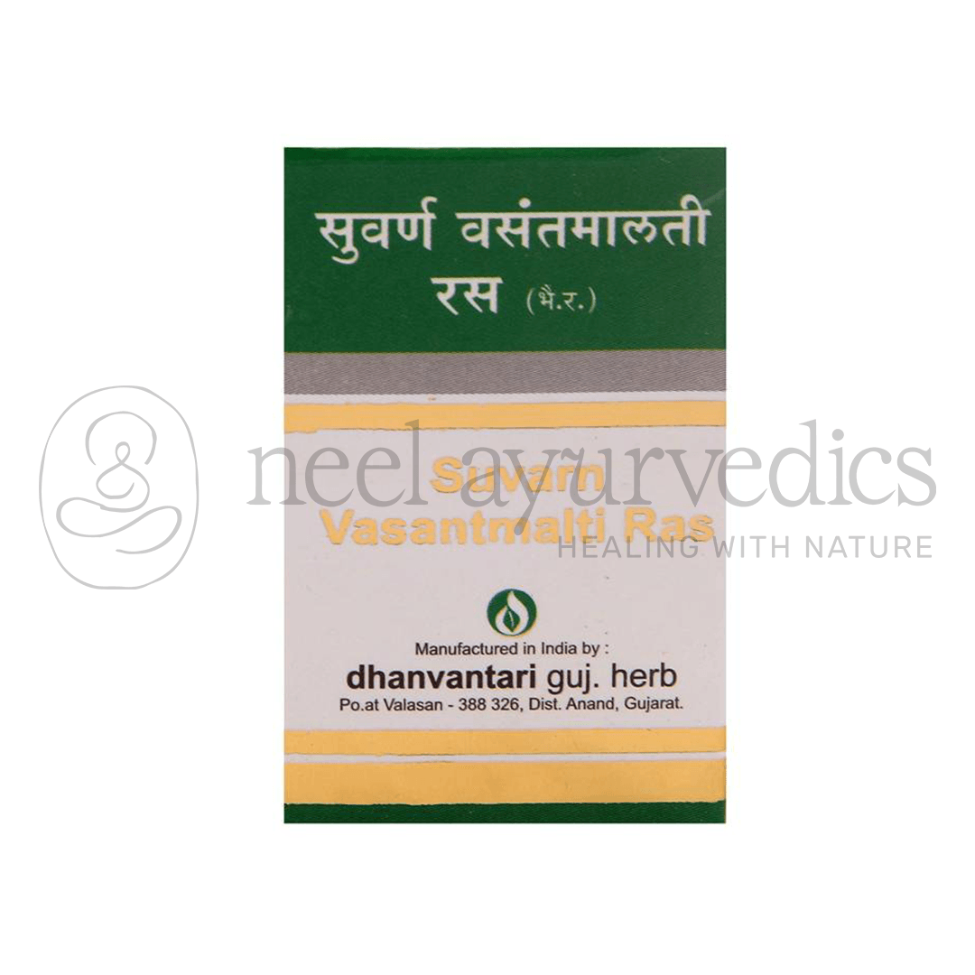 Dhanvantari Suvarna Vasantmalti Ras (S.Y) is a powerful Ayurvedic formulation enriched with Suvarna Bhasma (Gold Ash) and other rejuvenating herbs. This classical Rasayana is known for its immunity-boosting, revitalizing, and therapeutic properties, making it highly effective for various health concerns.