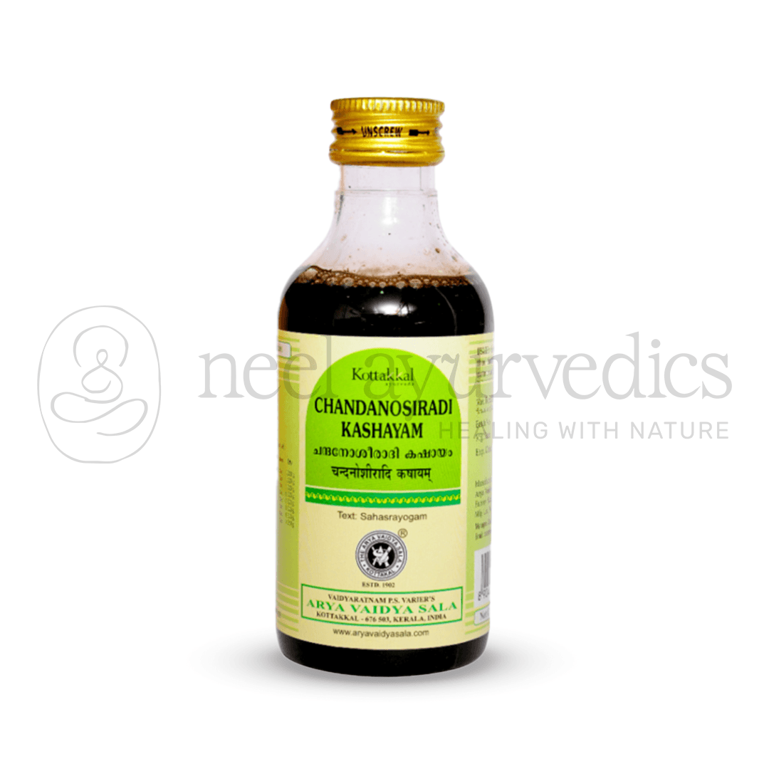 Kottakkal Arya Vaidya Sala Chandanosiradi Kashayam is a traditional Ayurvedic decoction from Kottakkal Arya Vaidya Sala, formulated to manage hemorrhagic and Pitta-related disorders. This cooling herbal formulation helps soothe internal inflammation, reduce burning sensations, and control bleeding tendencies associated with aggravated Pitta dosha.