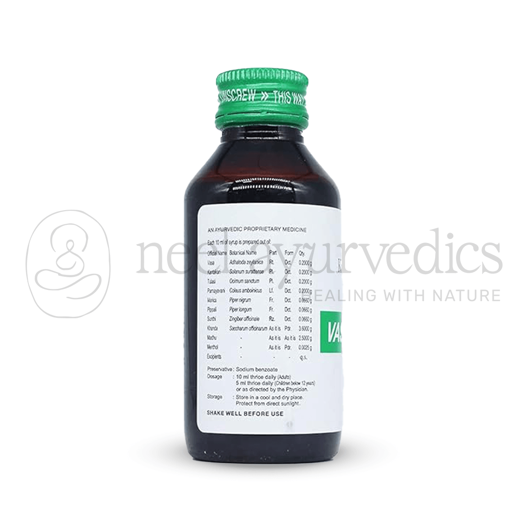 Kottakkal Arya Vaidya Sala Vasakot Syrup is a classical Ayurvedic formulation designed to provide natural relief from cough and respiratory discomforts. Enriched with powerful herbs such as Vasa (Adhatoda vasica), Tulsi, Pippali, and Sunthi (Ginger), it works as a soothing expectorant that clears excess mucus, reduces throat irritation, and promotes easier breathing.