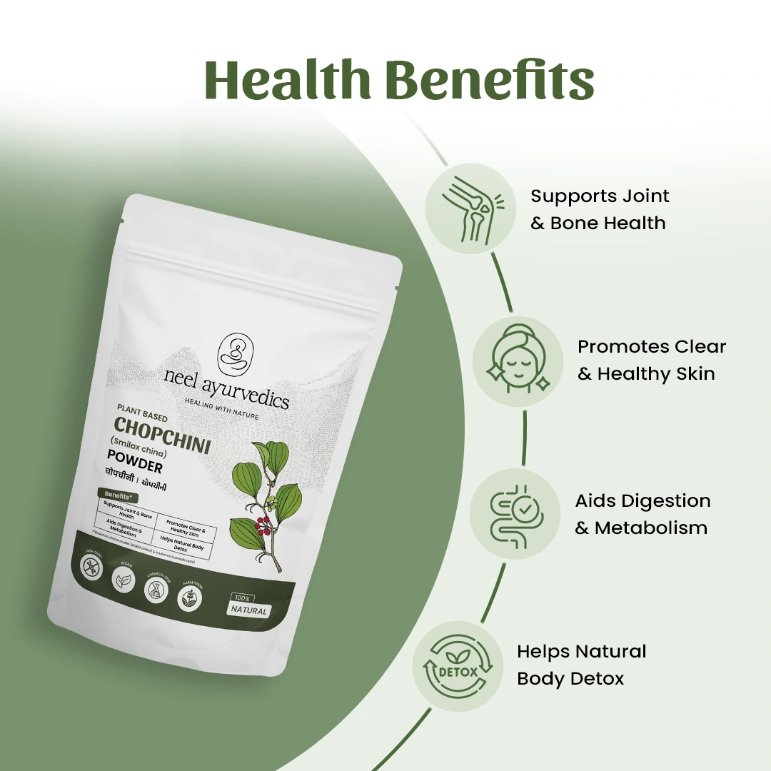 Chopchini Churna is a revered Ayurvedic formulation traditionally used for its digestive, detoxifying, and joint-supporting properties. Sourced from high-quality herbal roots, this powder helps enhance overall well-being by supporting various physiological functions in the body.