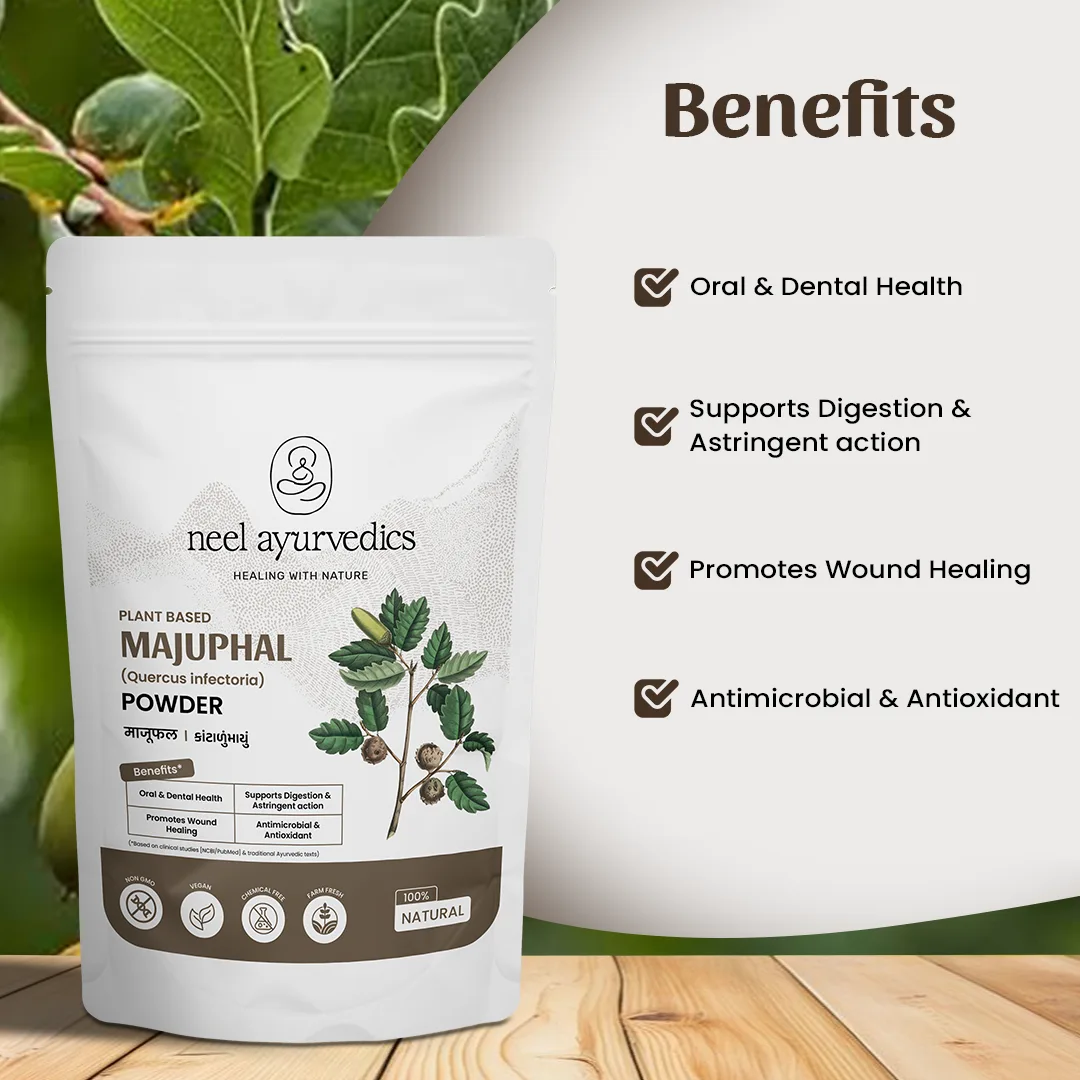 Majuphal is rich in tannins, which help tighten tissues, control bleeding, and reduce excessive discharges—making it ideal for oral, skin, and wound applications.