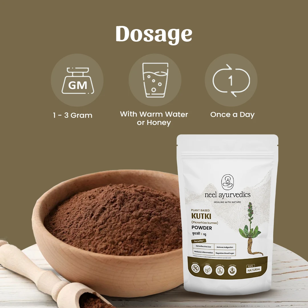 Take ½ teaspoon (2–3 grams) of Kutki Powder with warm water, once or twice daily, or as advised by your healthcare provider.
