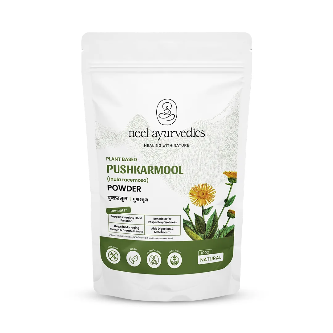 Pushkarmool Churna is a time-honored Ayurvedic formulation made from the root of Inula racemosa, traditionally used to support the heart and respiratory system. Known for its anti-allergic, cardioprotective, and stress-relieving properties, this herbal powder also plays a role in maintaining healthy liver and kidney function. Free from chemicals, preservatives, and artificial additives, it is a pure, natural wellness solution rooted in Ayurveda.