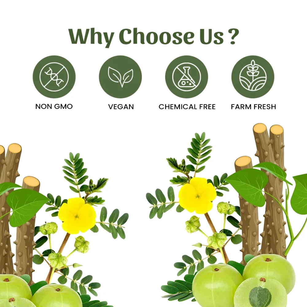 - Amla – It is rich in vitamin C and antioxidants, aiding in combating free radicals and supporting cellular health. It also supports digestive function, alleviates acidity, and aids in nutrient absorption. Amla strengthens the overall immune system, promoting well-being and vitality.