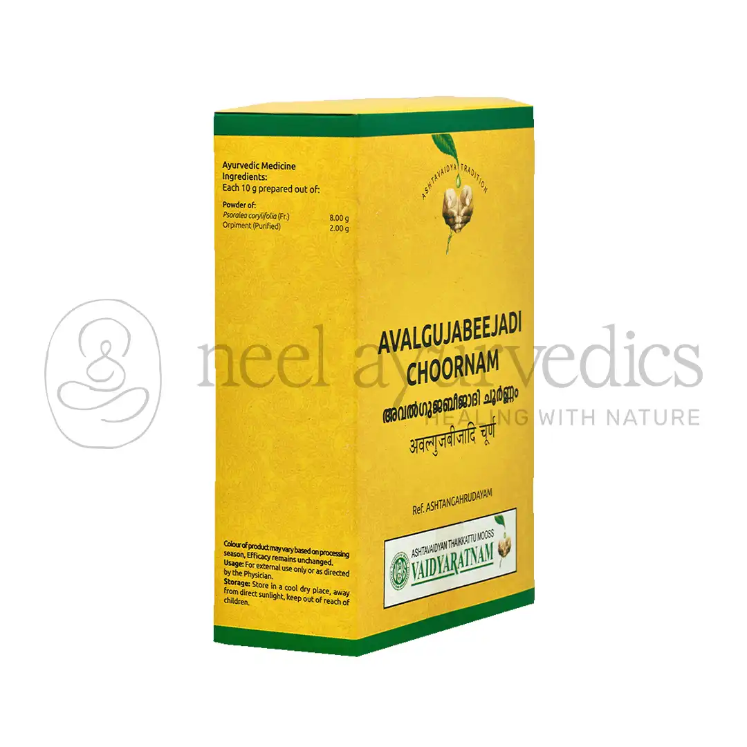 Vaidyaratnam Avalgujabeejadi Choornam is a trusted Ayurvedic solution for leucoderma and skin pigmentation issues, helping restore skin’s natural tone safely and effectively.