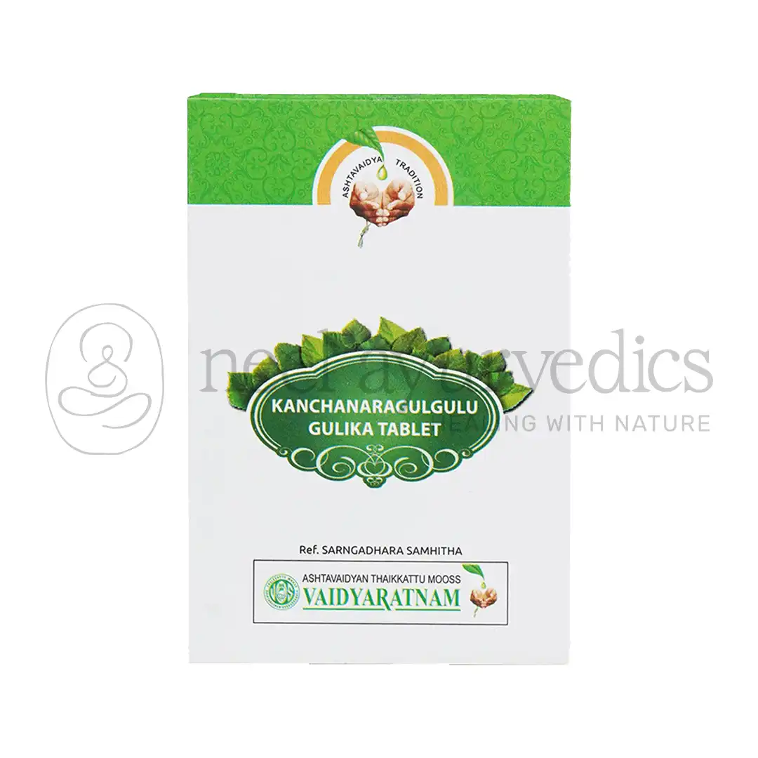 Vaidyaratnam Kanchanara Gulgulu Gulika is a trusted Ayurvedic formulation specifically designed to support thyroid health, lymphatic disorders, and various skin conditions. With a potent blend of natural herbs like Kanchanara (Bauhinia variegata), Guggulu (Commiphora wightii), and Triphala components (Haritaki, Vibhitaki, Amalaki), this classical remedy is effective in managing goiter, abdominal lumps, cysts, chronic lymphadenopathy, and skin disorders such as ulcers and fistula-in-ano.