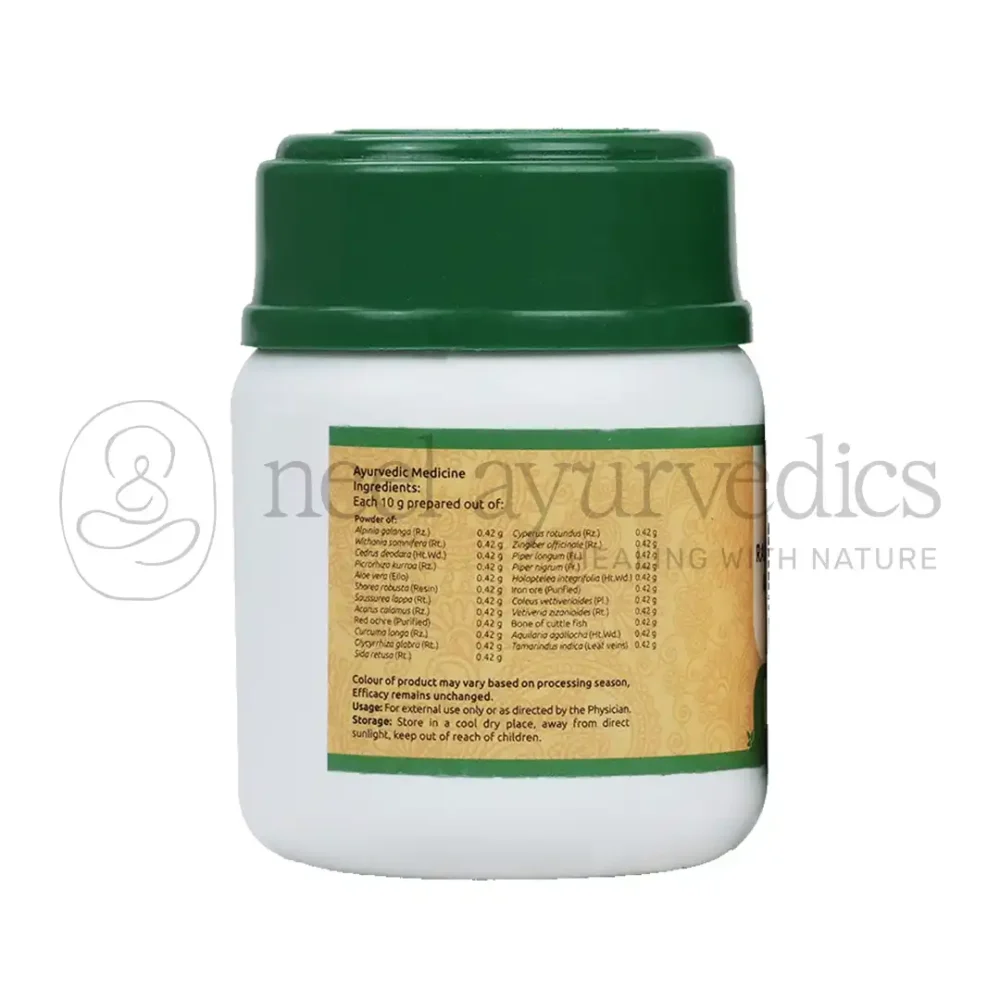 Vaidyaratnam Rasnadi Choornam is a traditional Ayurvedic formulation trusted for relieving fever, headache, and catarrhal conditions. This herbal powder is especially effective against common cold, sinus congestion, and seasonal illnesses, offering quick relief when applied externally. It balances the body’s natural energies, reduces inflammation, and supports immunity, making it a safe and effective choice for respiratory and fever-related ailments.