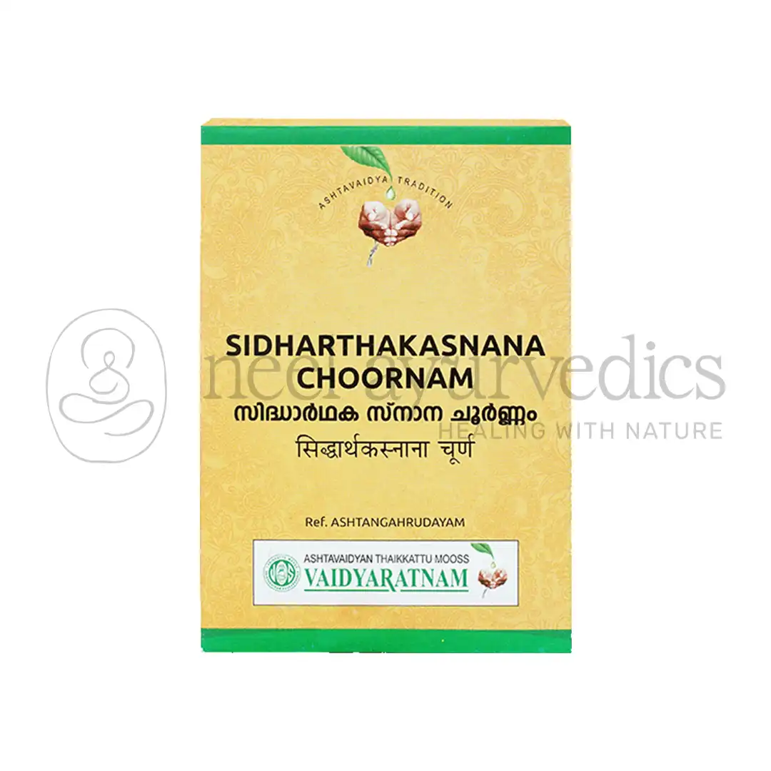 Vaidyaratnam Sidharthaka Sana Choornam is a traditional Ayurvedic bathing powder formulated to support skin health and healing. Enriched with powerful herbs like Mustha, Triphala (Hareethaki, Vibheethaki, Amalaki), Karanja, Aragwadha, Daruharidra, and Kushta, this choornam is highly beneficial in managing skin diseases, irritation, scars, and inflammation. Used externally as a bathing powder or lepa (herbal paste), it helps cleanse and rejuvenate the skin naturally, without harsh chemicals.