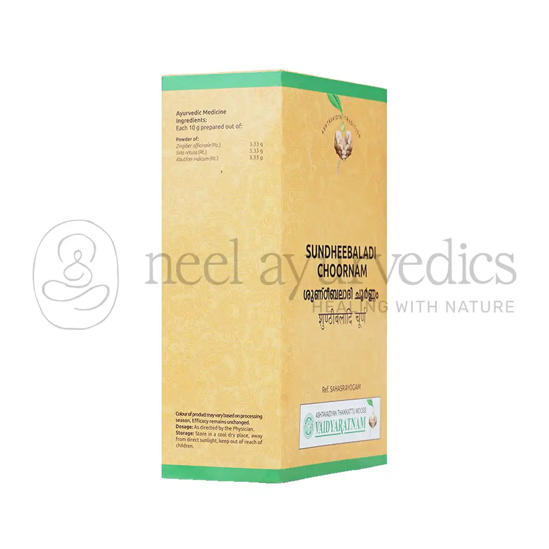 Vaidyaratnam Sundheebaladi Kashaya Choornam is a traditional Ayurvedic remedy formulated to relieve numbness caused by rheumatic and neurological disorders. Enriched with potent herbs like Sunti (Ginger), Bala, and Atibala, it helps restore nerve function, reduce inflammation, and support overall neurological health.