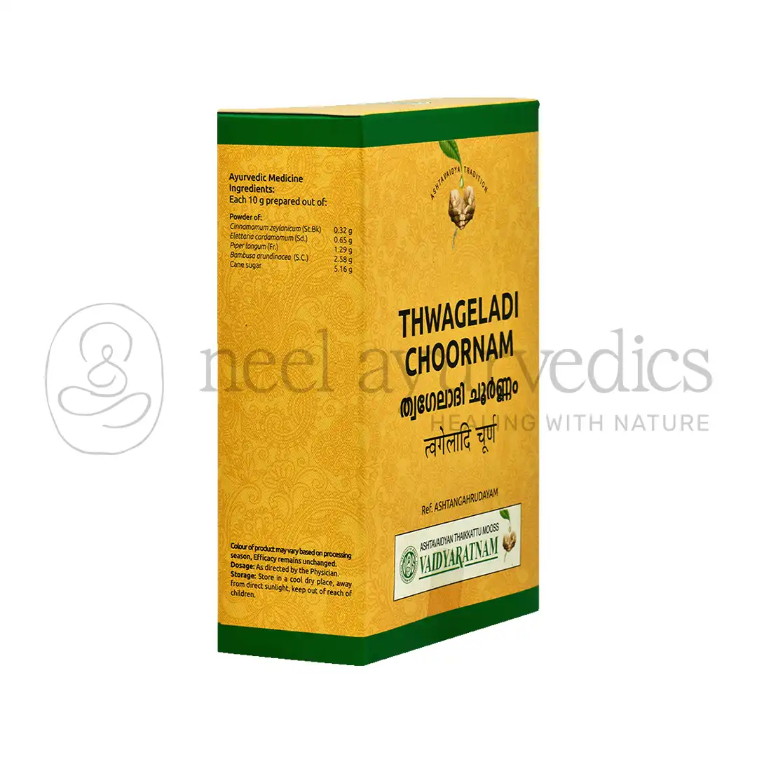 Vaidyaratnam Thwageladi Choornam is a classical Ayurvedic formulation beneficial for respiratory health and throat-related ailments. Enriched with powerful herbs like Twak (Cinnamon), Ela (Cardamom), Pippali (Long pepper), Vamsa, and Sitha (Cane sugar), this choornam provides effective relief in conditions such as cough, asthma, and hoarseness of voice. Its soothing and expectorant properties help clear respiratory passages while improving voice clarity and lung function.